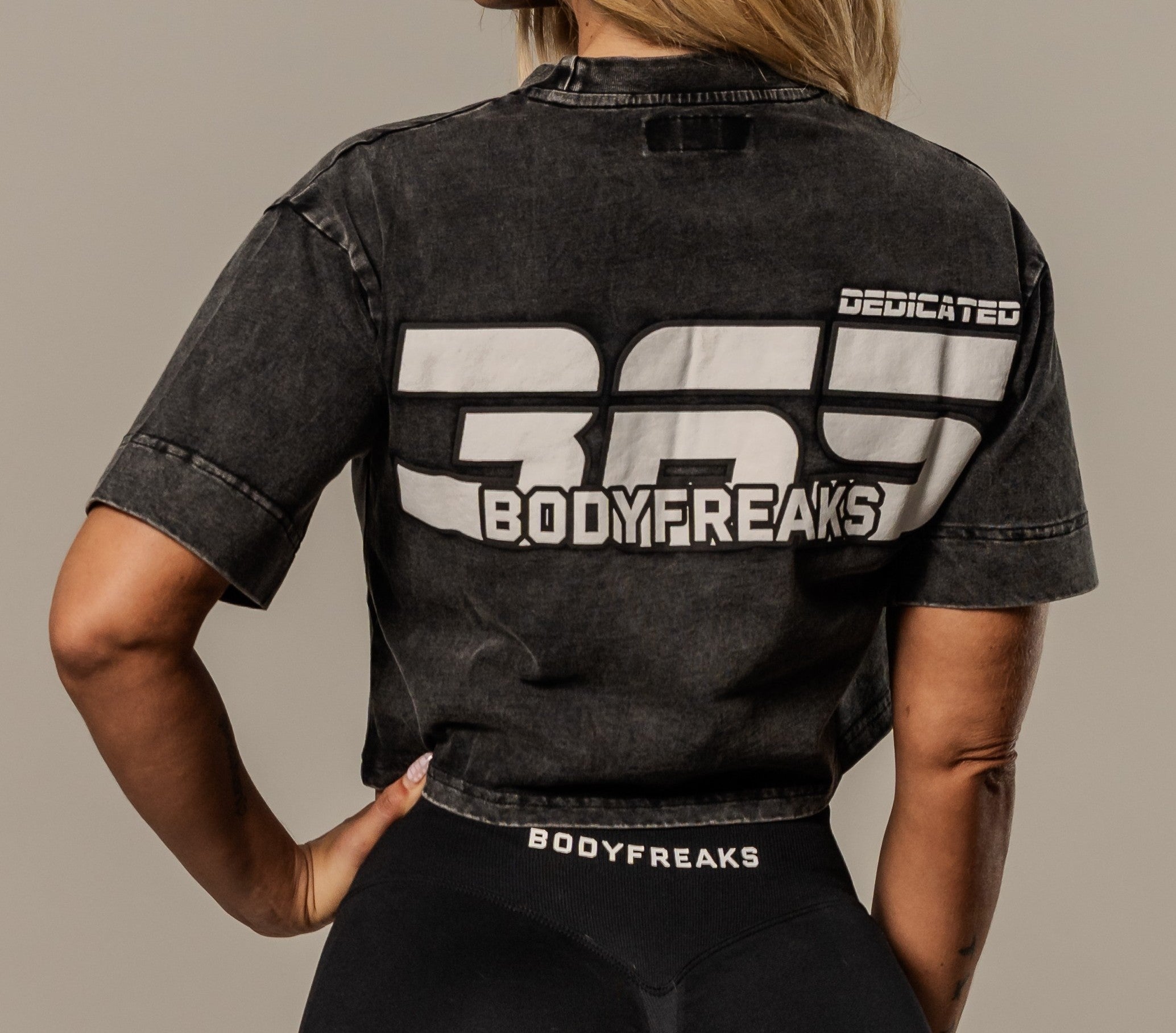 Dedicated 365 Crop Tee - STONE WASH BLACK This crop tee features the Dedicated 365 logo on the back and  an oversized fit for a comfortable and stylish look. The acid wash adds a trendy touch, making it the perfect addition to your wardrobe. Stay dedicated all year long with...